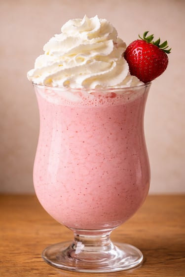 Um milkshake cor-de-rosa, cremoso, geladinho e cheio de sabor doce e levemente azedinho do morango.